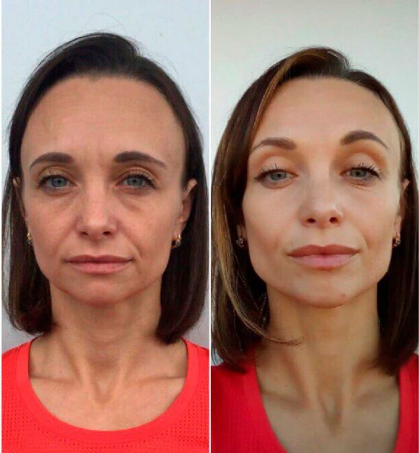 Catalina, yo la usé durante un mes, otras personas del grupo la usaron más tiempo. Pero los primeros resultados los pude ver tan pronto como al séptimo día. Aquí están mis fotos. Puedes ver que me veo mucho más joven. Las arrugas alrededor de los ojos desaparecieron y los pliegues casi no existen.